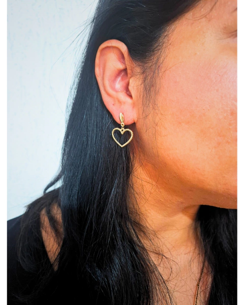 Este brinco encantador é banhado em ouro 18k e apresenta um coração vazado adornado com detalhes pontilhados, adicionando um toque de romance ao seu visual.